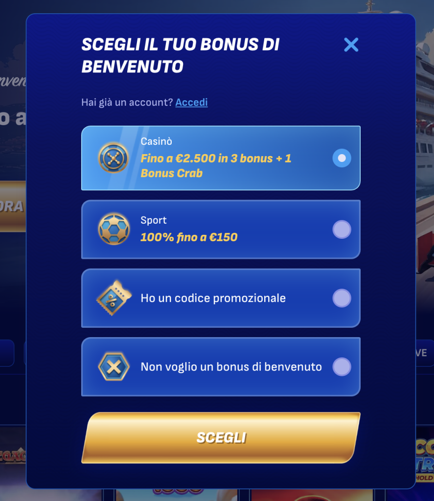 - Scegli il bonus di benvenuto tra le opzioni disponibili (ce ne sono diversi!).